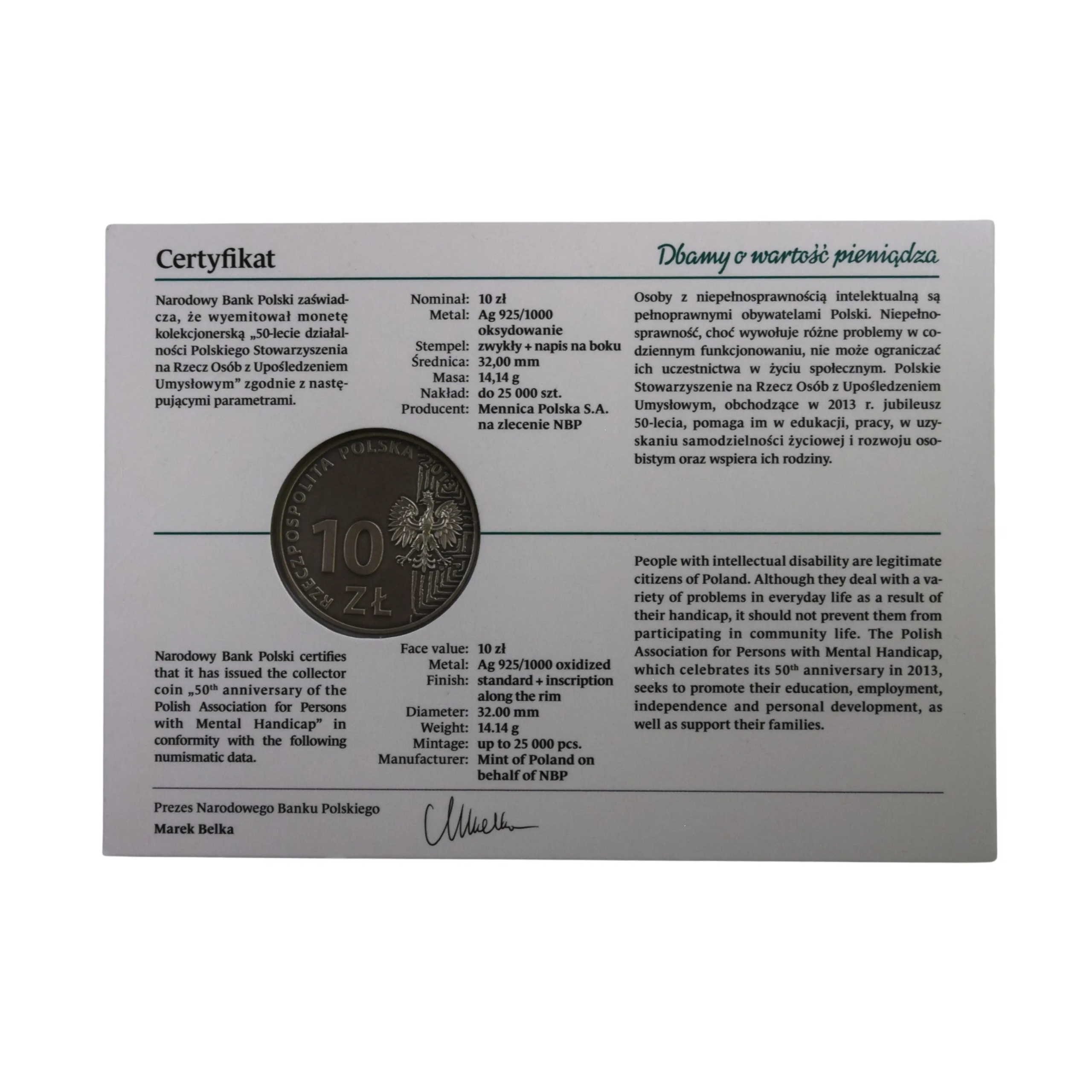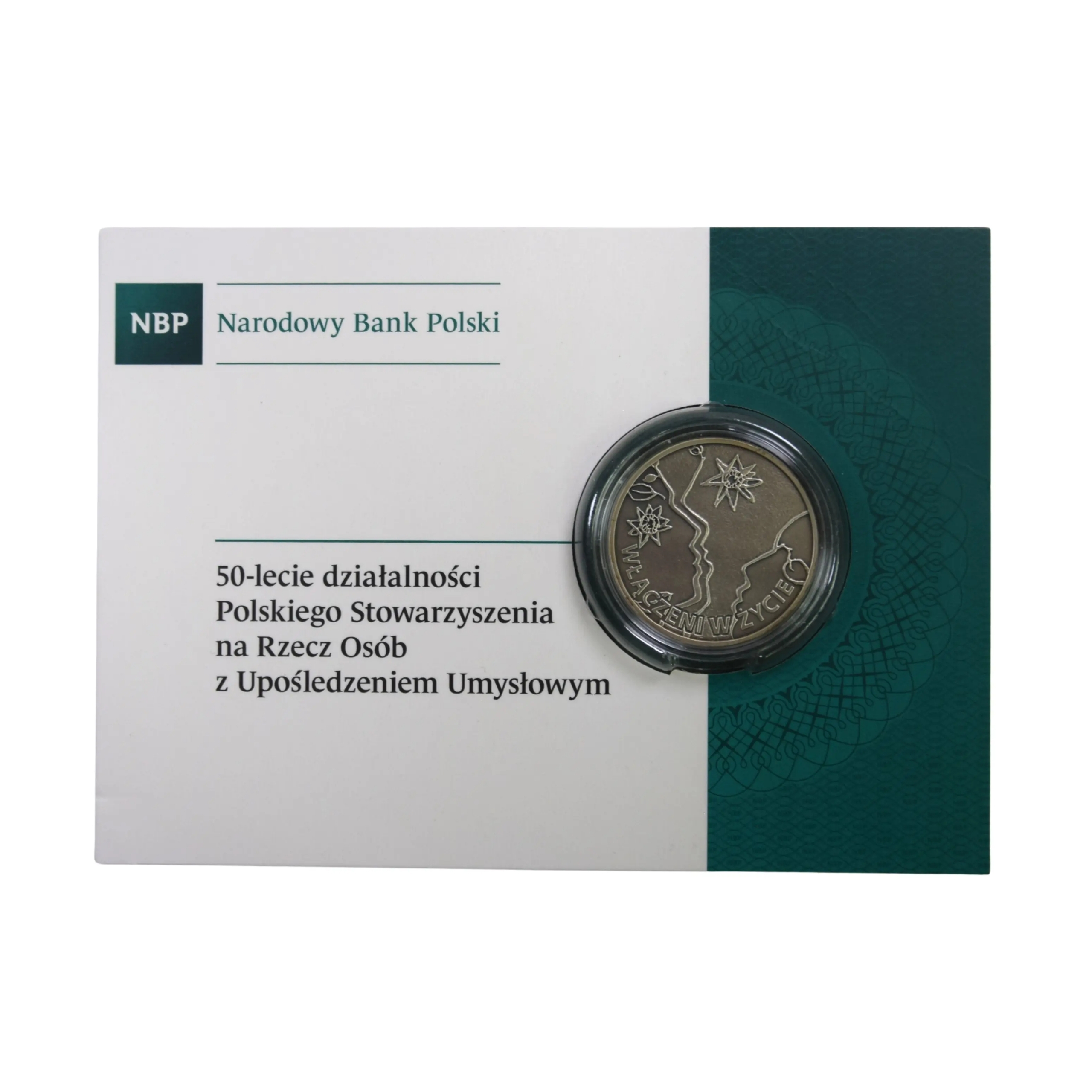 Srebrna moneta kolekcjonerska 10 zł 50-lecie działalności Polskiego Stowarzyszenia na Rzecz Osób z Upośledzeniem Umysłowym
