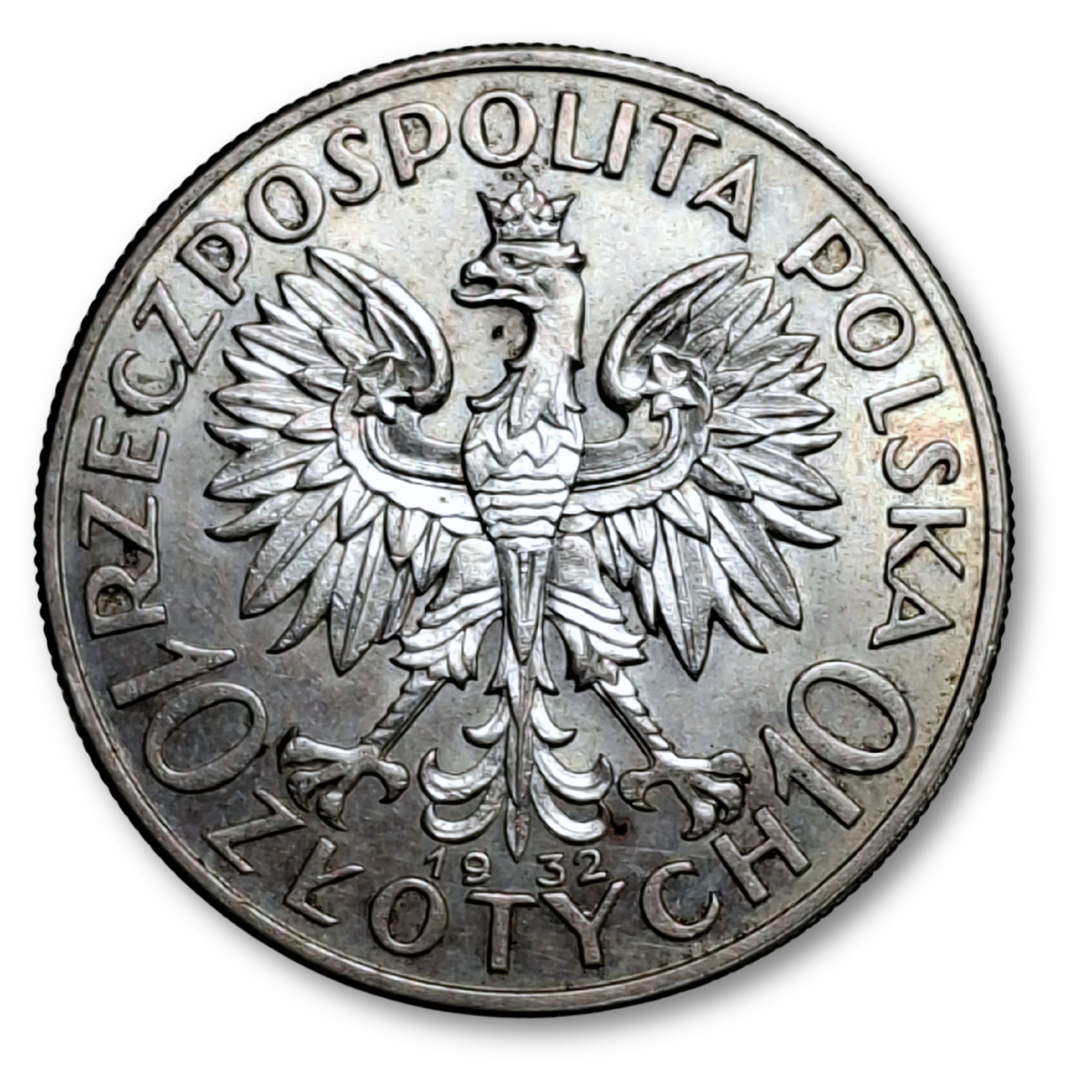 Moneta dziesięciozłotowa, bita w srebrze próby 750, wprowadzona do obiegu 29 sierpnia 1932 r. rozporządzeniem Ministra Skarbu Jana Piłsudskiego z dnia 28 sierpnia 1932 r. Wycofana na podstawie rozporządzenia ministrów gospodarki, finansów i spraw wewnętrznych Rzeszy wydanego 22 listopada 1939 r. w okresie Generalnego Gubernatorstwa, wg którego monety bite w srebrze w okresie II Rzeczypospolitej należało obowiązkowo wymieniać na pieniądze papierowe. Była bita w latach 1932-1933 w Londynie i Warszawie. Monety warszawskie mają znak mennicy.