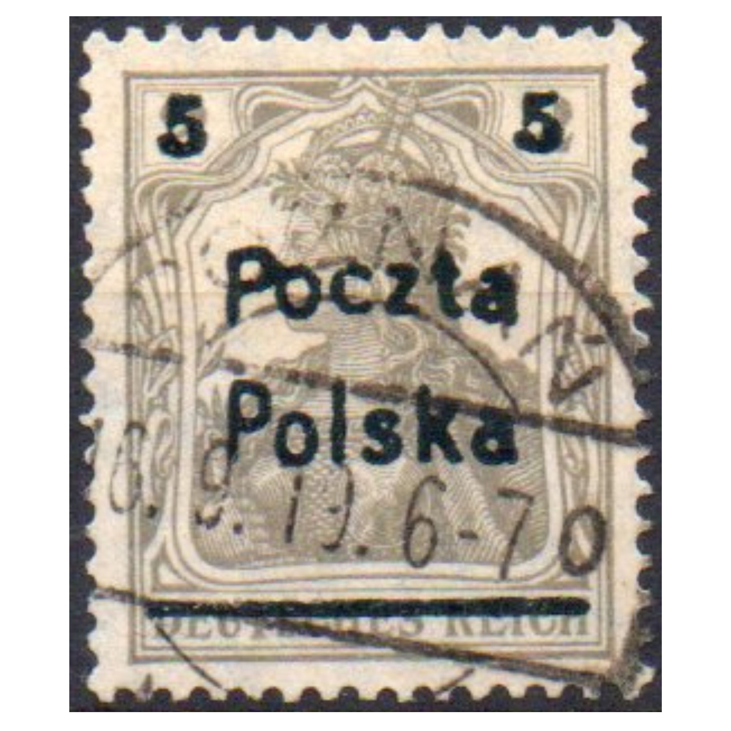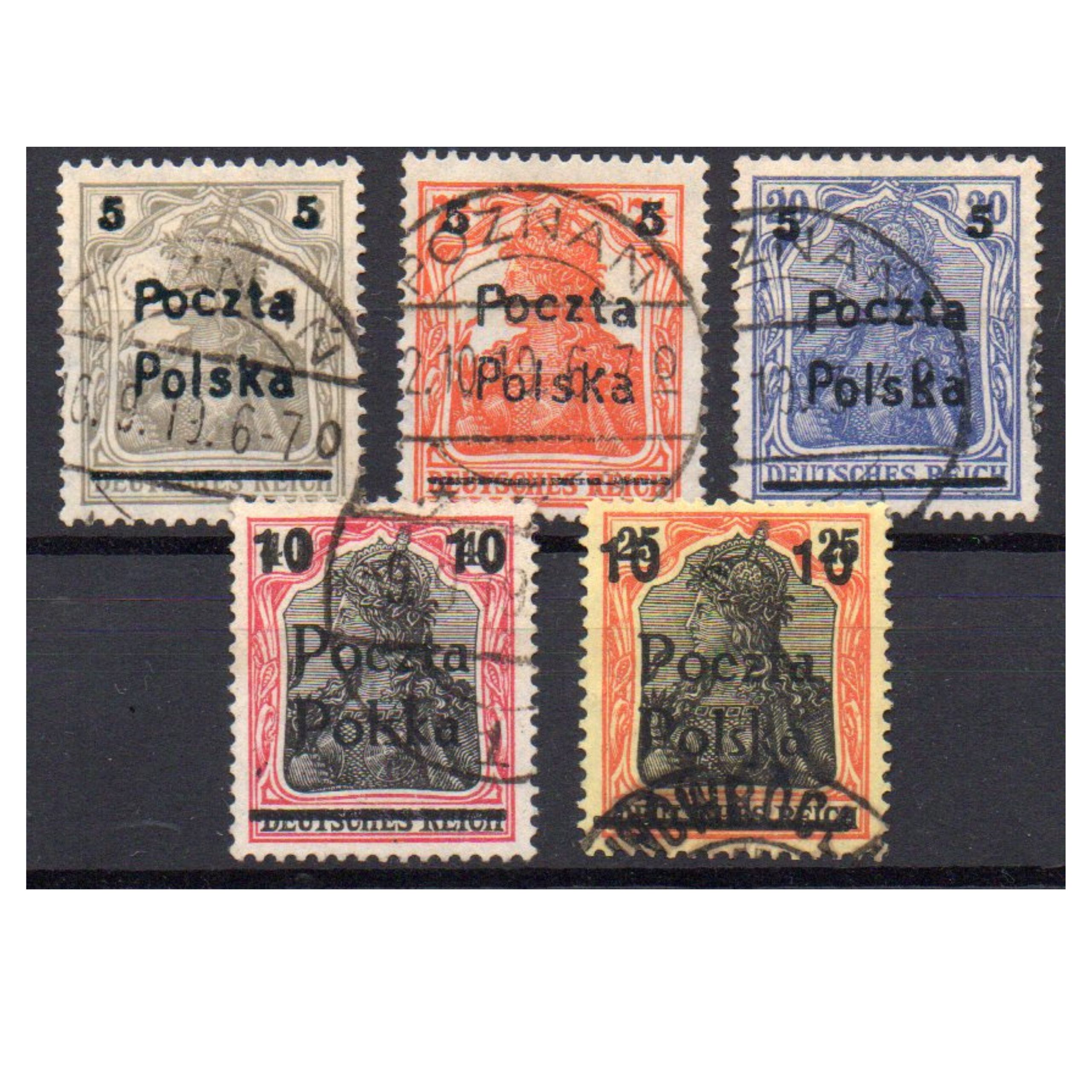 Znaczki pochodzą z wydania przedrukowego – Ministerstwa Poczt i Telegrafów w Poznaniu. Do przedruku użyto znaczka Germanii, która była personifikacją Niemiec. Znaczek opatrzono nadrukiem z nowym nominałami nazwą Poczta Polska.