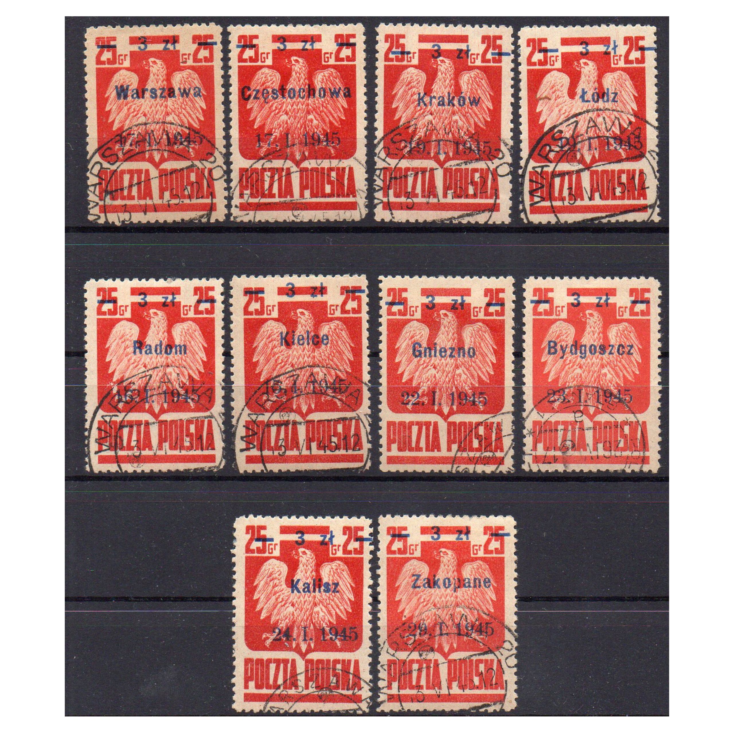 Seria upamiętniająca wyzwolenie kolejnych 10 polskich miast w styczniu 1945 r. Znaczki są przedrukiem waloru "Goznak". Na każdym jest nowy nominał - 3 zł - nazwa miasta i data wyzwolenia.