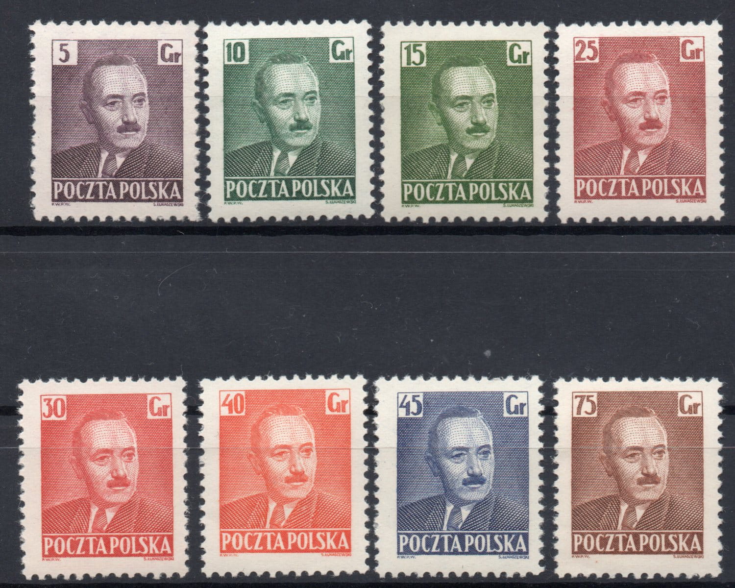 Prezentujemy pełną serię ośmiu znaczków pocztowych z 1950 roku, przedstawiających portret Bolesława Bieruta. Jako najważniejsza postać polityczna powojennej Polski – pełniąc funkcje Prezydenta RP, Prezesa Rady Ministrów oraz lidera PZPR – Bierut stał się głównym motywem oficjalnej ikonografii państwowej. Seria ta jest doskonałym przykładem filatelistyki z okresu stalinizmu, odzwierciedlającym ówczesną stylistykę i kult jednostki, co czyni ją istotnym dokumentem historycznym w każdym zbiorze tematycznym poświęconym PRL.