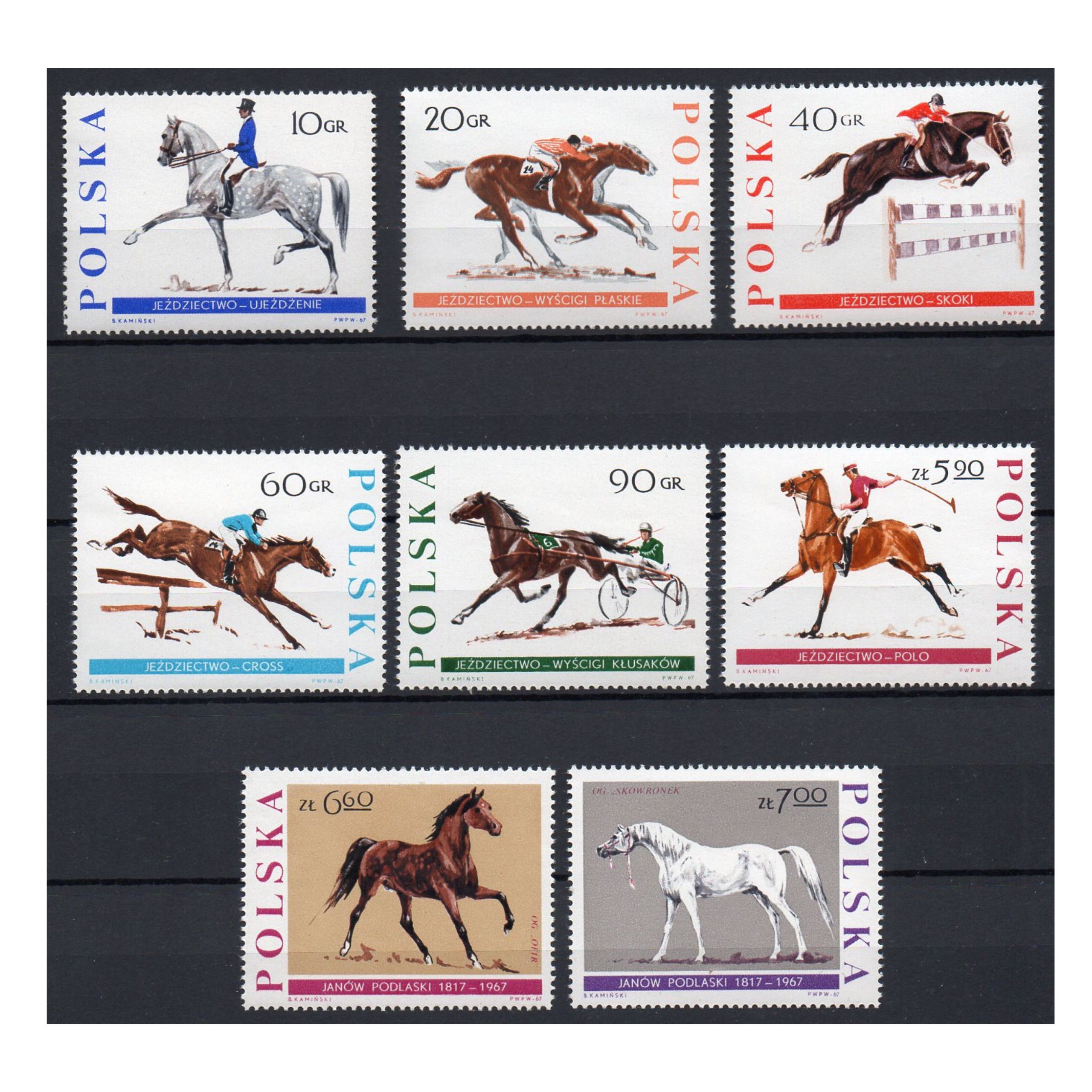 Jeździectwo to konkurencje sportów konnych wraz z powożeniem. Na znaczkach przedstawiono konkurencje jeździeckie: ujeżdżanie, wyścigi płaskie, skoki, cross, wyścigi kłusaków, polo oraz słynne konie stadniny w Janowie Podlaskim: ogiery "Ofir" i "Skowronek".