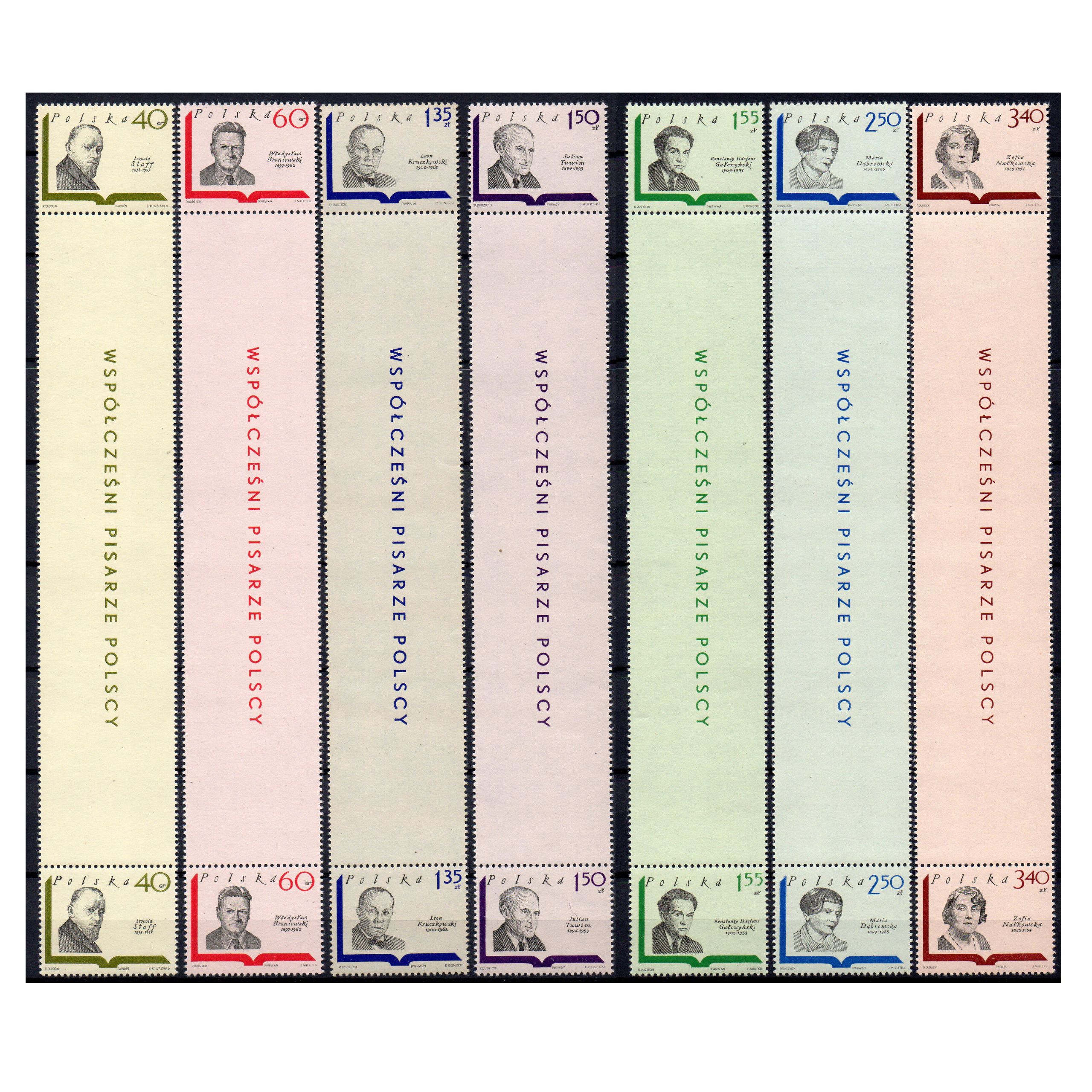 Prezentujemy Państwu serię znaczków z roku 1969 - Współcześni pisarze polscy. Na znaczkach przedstawiono: Leopolda Staffa, Władysława Broniewskiego, Leona Kruczkowskiego, Juliana Tuwima, Konstantego I. Gałczyńskiego, Marię Dąbrowską i Zofię Nałkowską.