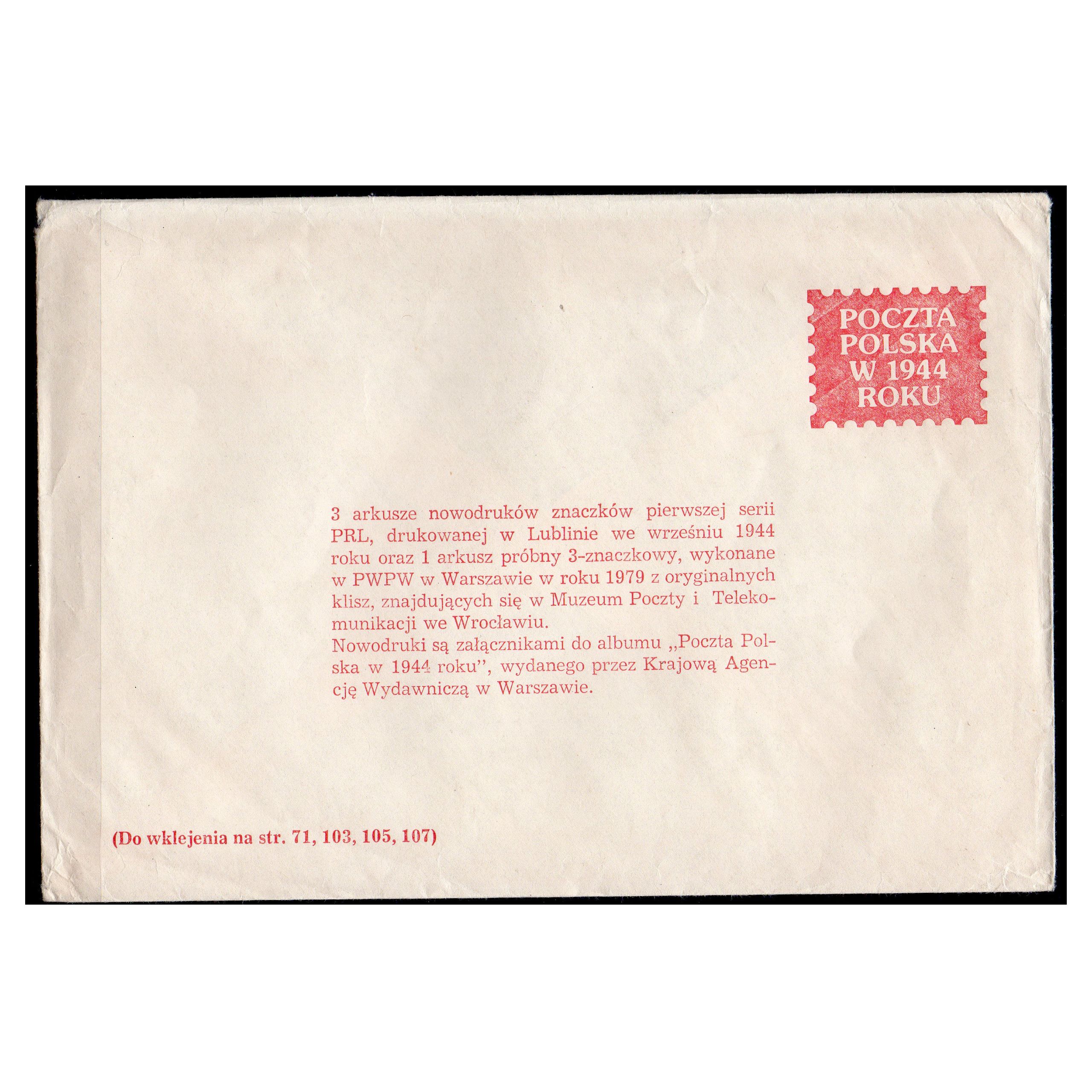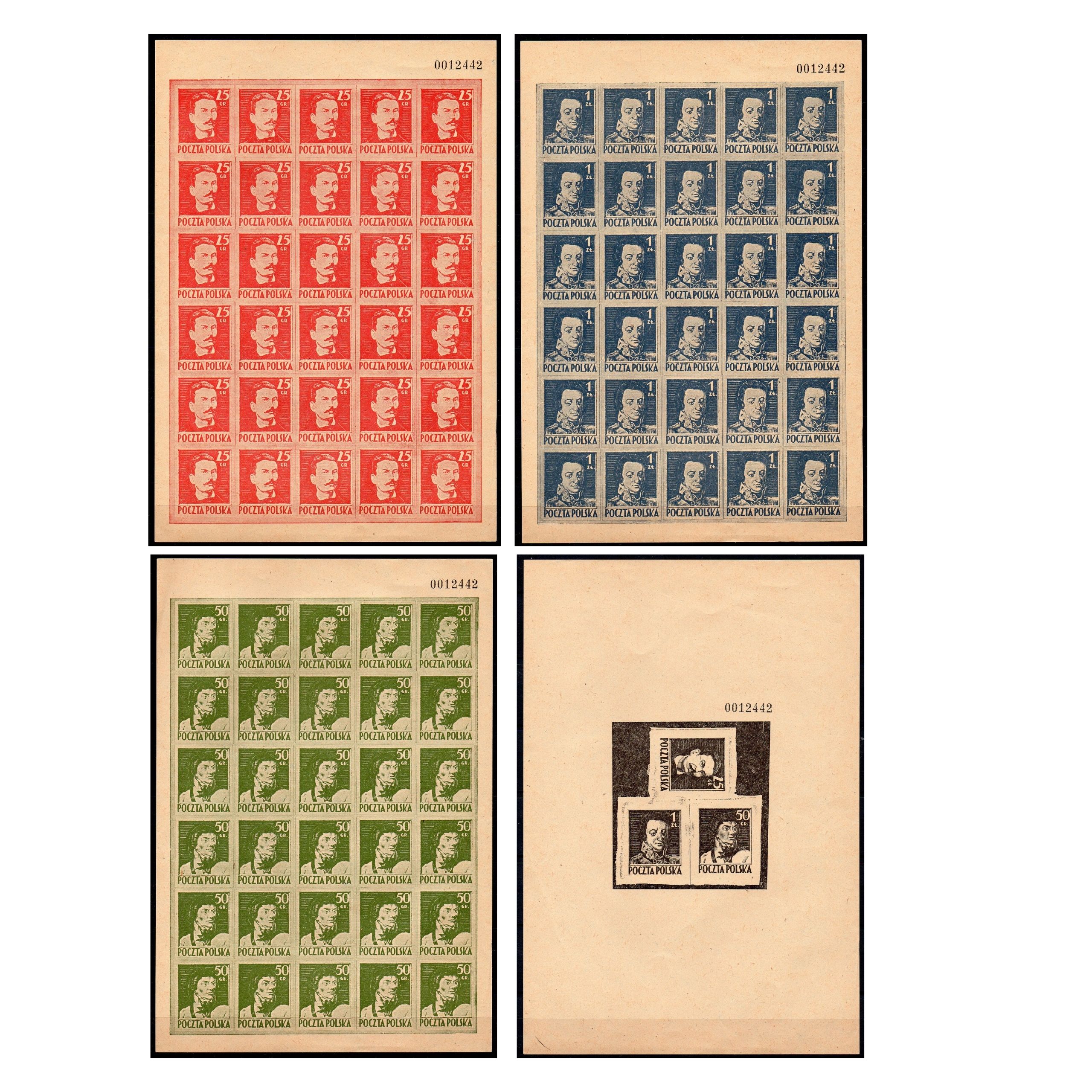 Prezentujemy 3 arkusze nowodruków znaczków pierwszej serii PRL „Wodzowie”. Seria oryginalnie drukowana była w Lublinie we wrześniu 1944 roku. Na potrzeby książki „Poczta Polska w 1944 roku” wydanej w 1978 roku wykonano w PWPW, z oryginalnych klisz przechowywanych przez Muzeum Poczty i Telekomunikacji we Wrocławiu, nowodruki wspomnianych arkuszy oraz nowodruk próby siatkowej. Arkusze i próba są numerowane.