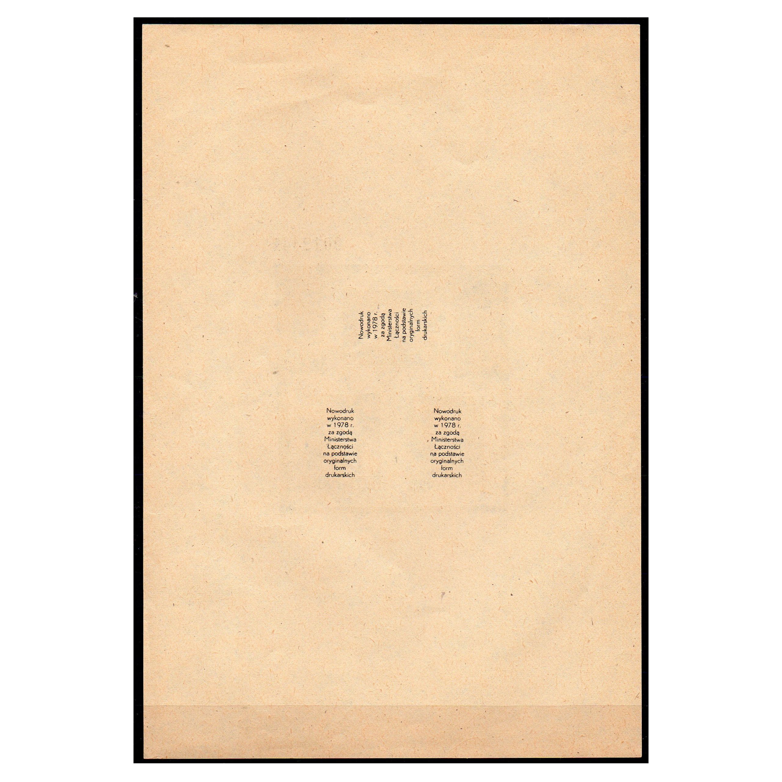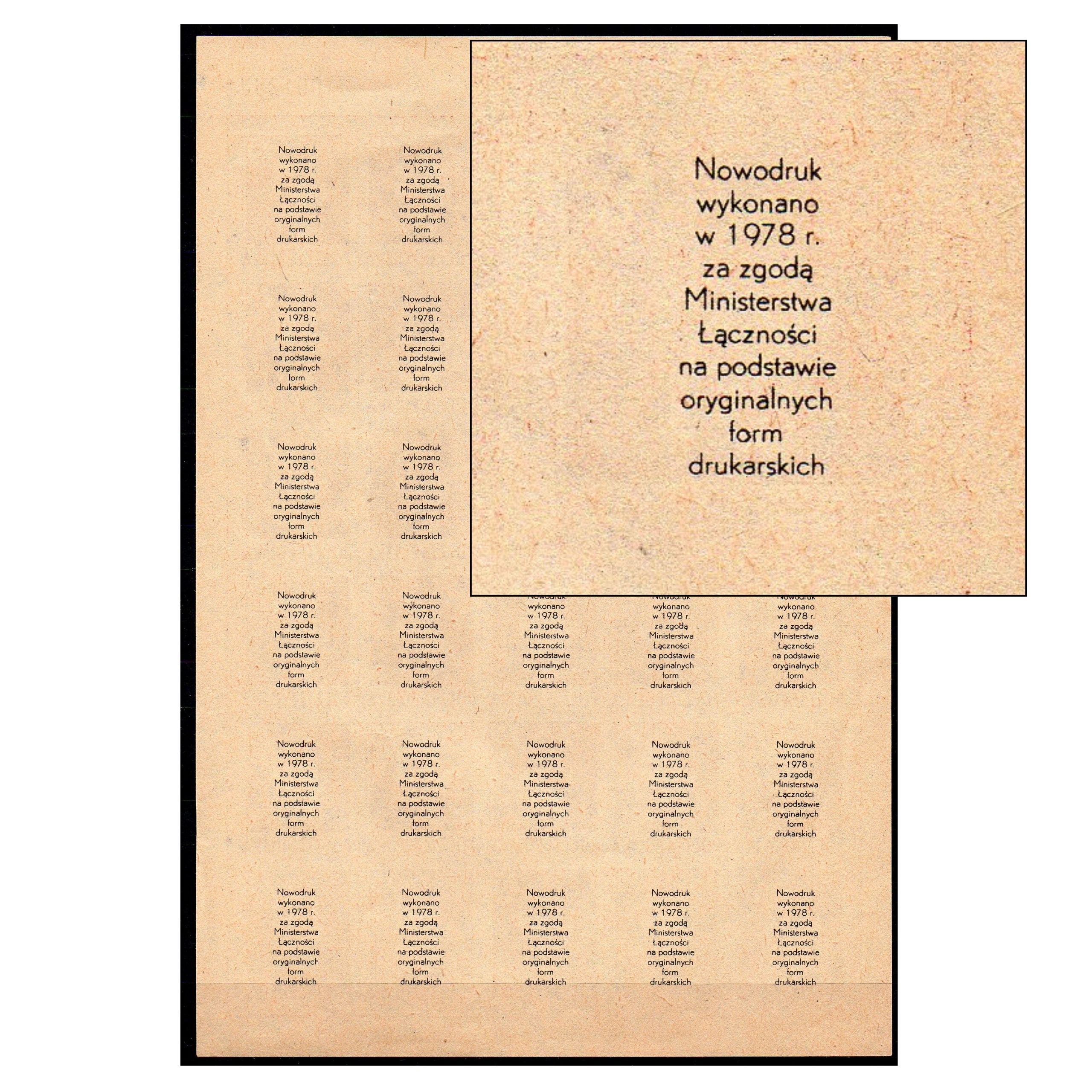 Każdy znaczek w arkuszach oraz próbie ma z tyłu nadruk „Nowodruk wykonano w 1978 r. za zgodą Ministerstwa Łączności na podstawie oryginalnych form drukarskich”.