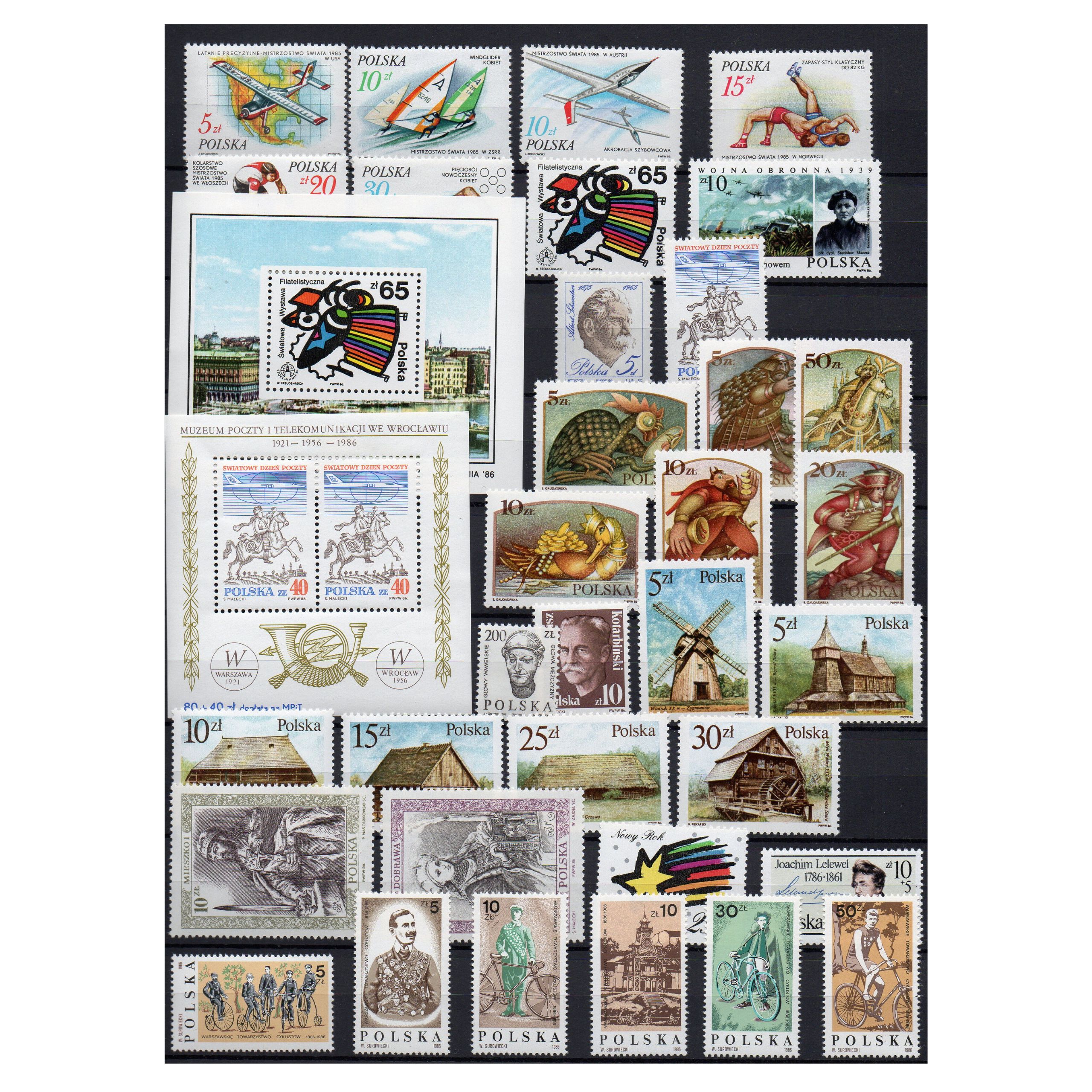 Kompletny zbiór znaczków polskich z roku 1986. Znaczki są czyste, bez podlepek. Zbiór zawiera 4 bloki: Polska żegluga bałtycka - promy, Światowa Wystawa Filatelistyczna „Stockholmia `86”, Światowy Dzień Poczty.