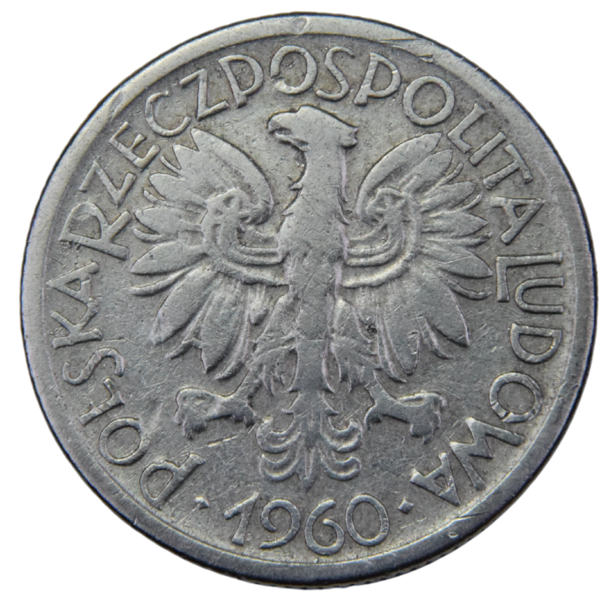 - Na awersie monety znajduje się godło Polskiej Rzeczypospolitej Ludowej – orzeł bez korony. Wokół orła widnieje napis „POLSKA RZECZPOSPOLITA LUDOWA” oraz rok emisji „1960”. Orzeł jest centralnym elementem awersu, a napis jest rozłożony równomiernie wokół niego, tworząc okrąg.