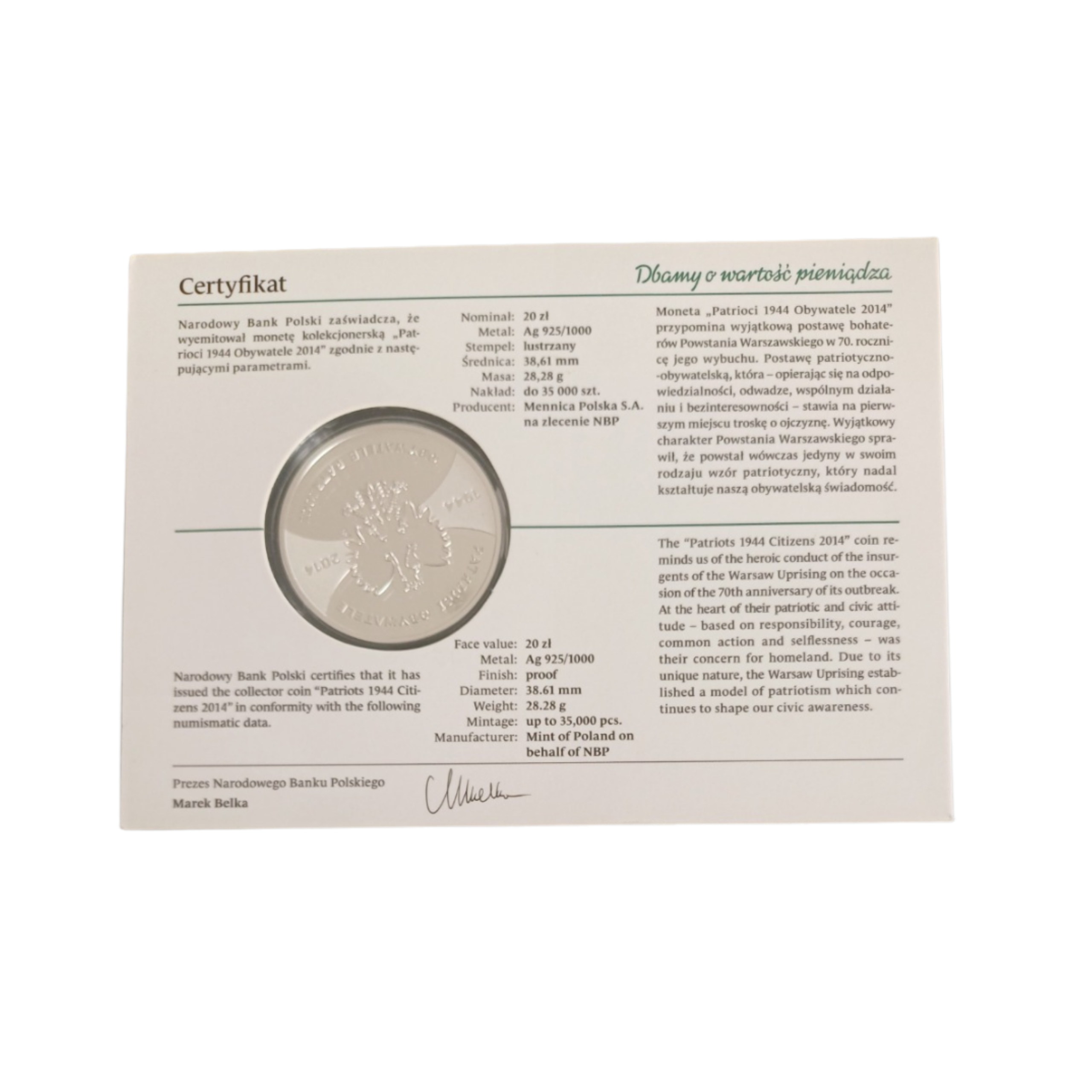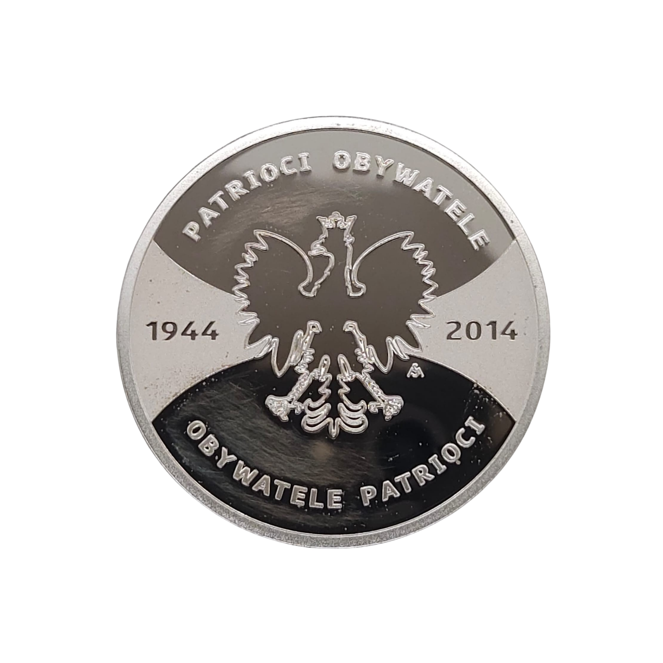 Patrioci 1944 Obywatele 2014 – moneta upamiętniająca 70. rocznicę wybuchu Powstania Warszawskiego, jednego z najważniejszych wydarzeń w historii Polski i symbolu bohaterstwa, patriotyzmu oraz obywatelskiego zaangażowania. Powstanie Warszawskie w 1944 r. było aktem niezwykłej odwagi i determinacji – walka i codzienne życie w warunkach wojennych stały się ikoną polskiej pamięci historycznej.