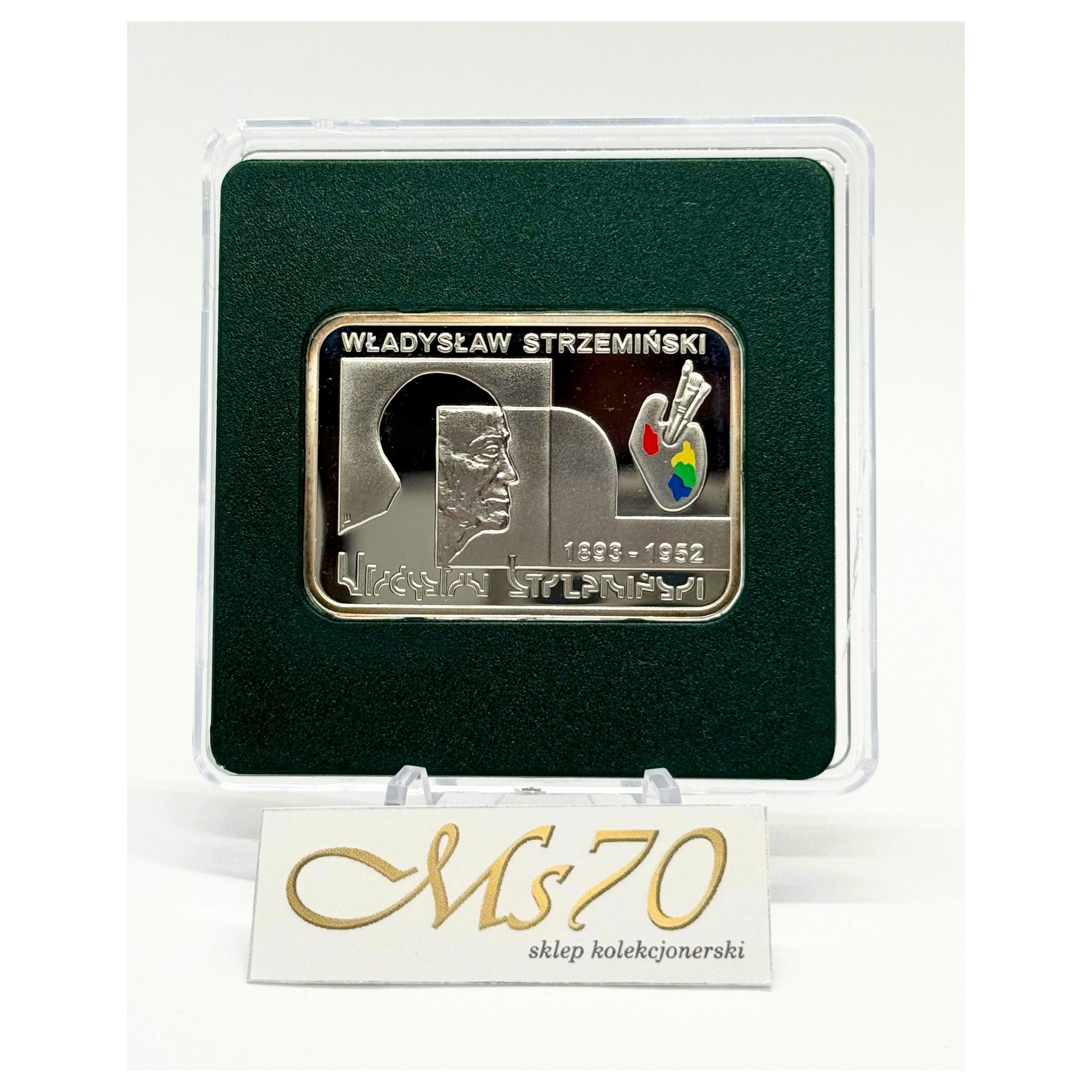 Moneta została wyemitowana, aby upamiętnić Władysława Strzemińskiego – wybitnego malarza, teoretyka sztuki, pioniera polskiej awangardy i twórcę teorii unizmu. Jest to kolejna moneta z serii „Polscy malarze XIX/XX wieku” o charakterystycznym prostokątnym kształcie. Rewers przedstawia profil malarza na tle jego dzieła „Kompozycja przestrzeni” z 1929 roku oraz paletę z farbami naniesionymi techniką tampondruku. Unikalnym elementem jest napis z nazwiskiem artysty u dołu monety, wykonany alfabetem stworzonym przez samego Strzemińskiego. Awers monety zdobi stylizowany wizerunek „Kompozycji unistycznej 13” z 1934 roku.
