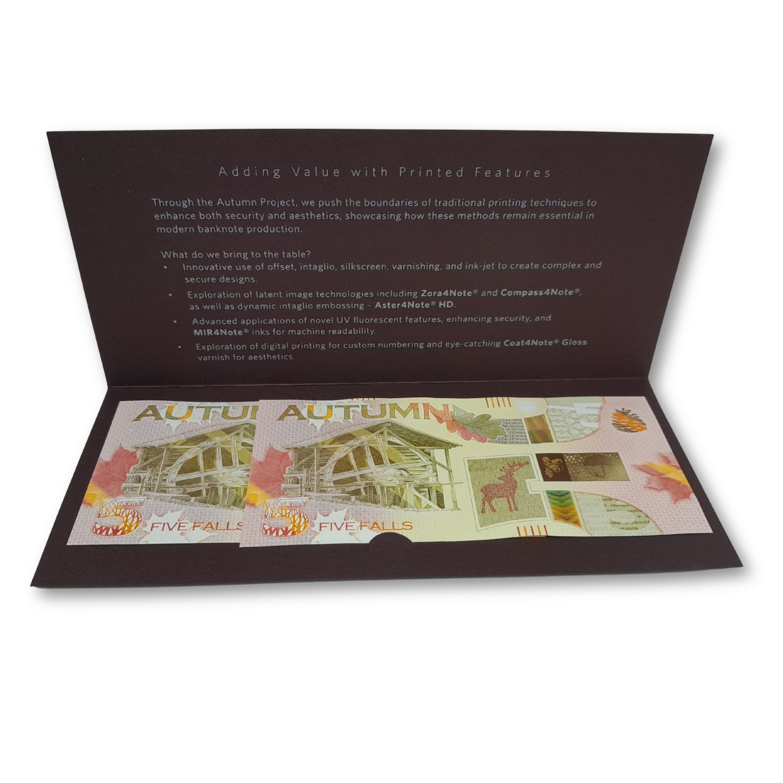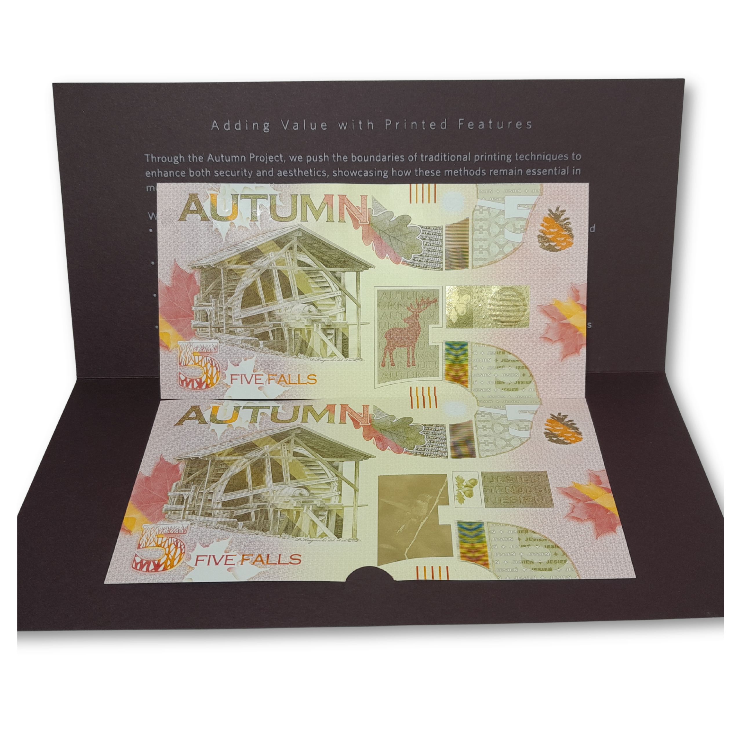 Prezentujemy wyjątkowy zestaw dwóch banknotów testowych wydanych przez Polską Wytwórnię Papierów Wartościowych (PWPW) jesienią 2024 roku pod nazwą „Autumn”. To niezwykły pokaz zaawansowanych technologii zabezpieczeń. Ciekawostką jest, że dwa banknoty tworzą efekt uzupełniania się nominału: po przyłożeniu jednego arkusza pod drugi, fragmenty graficzne łączą się, tworząc pełną cyfrę nominału „5”. Banknoty różnią się miedzy sobą elementami graficznymi na cyfrze „5”.