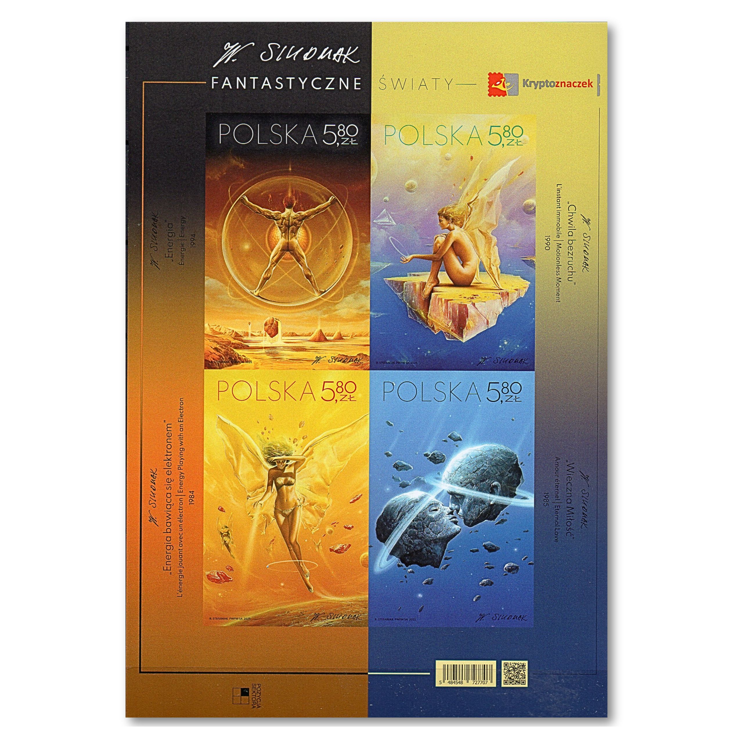 Prezentujemy Państwu wyjątkową serię czterech znaczków pocztowych z 2025 roku, która przenosi odbiorcę w głąb niezwykłego uniwersum realizmu fantastycznego. Emisja „Fantastyczne światy” jest hołdem dla twórczości Wojciecha Siudmaka – polskiego artysty o światowej sławie, którego prace zdobiły m.in. okładki legendarnej sagi „Diuna”. Na poszczególnych walorach uwieczniono cztery ikoniczne obrazy: „Energia” (5484), „Chwila bezruchu” (5485), „Energia bawiąca się elektronem” (5486) oraz pełną metafizycznego piękna „Wieczną Miłość” (5487). Te miniaturowe dzieła sztuki zachwycają precyzją detali i oniryczną atmosferą, stanowiąc perłę w kolekcji każdego miłośnika sztuki współczesnej i fantastyki.