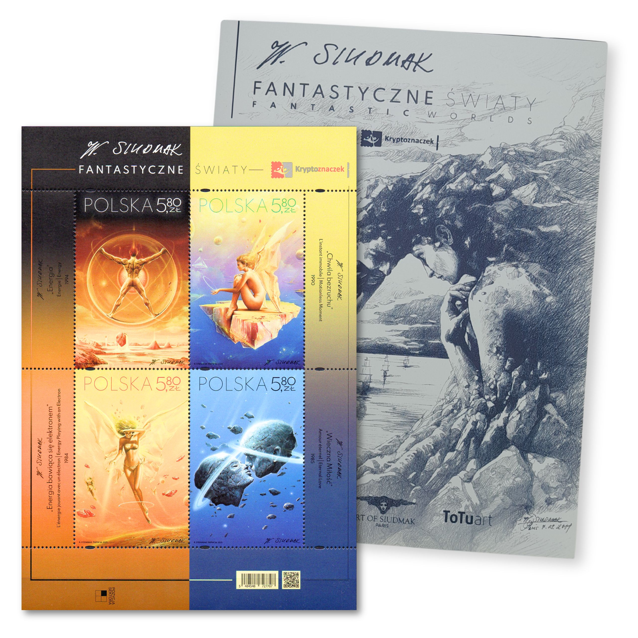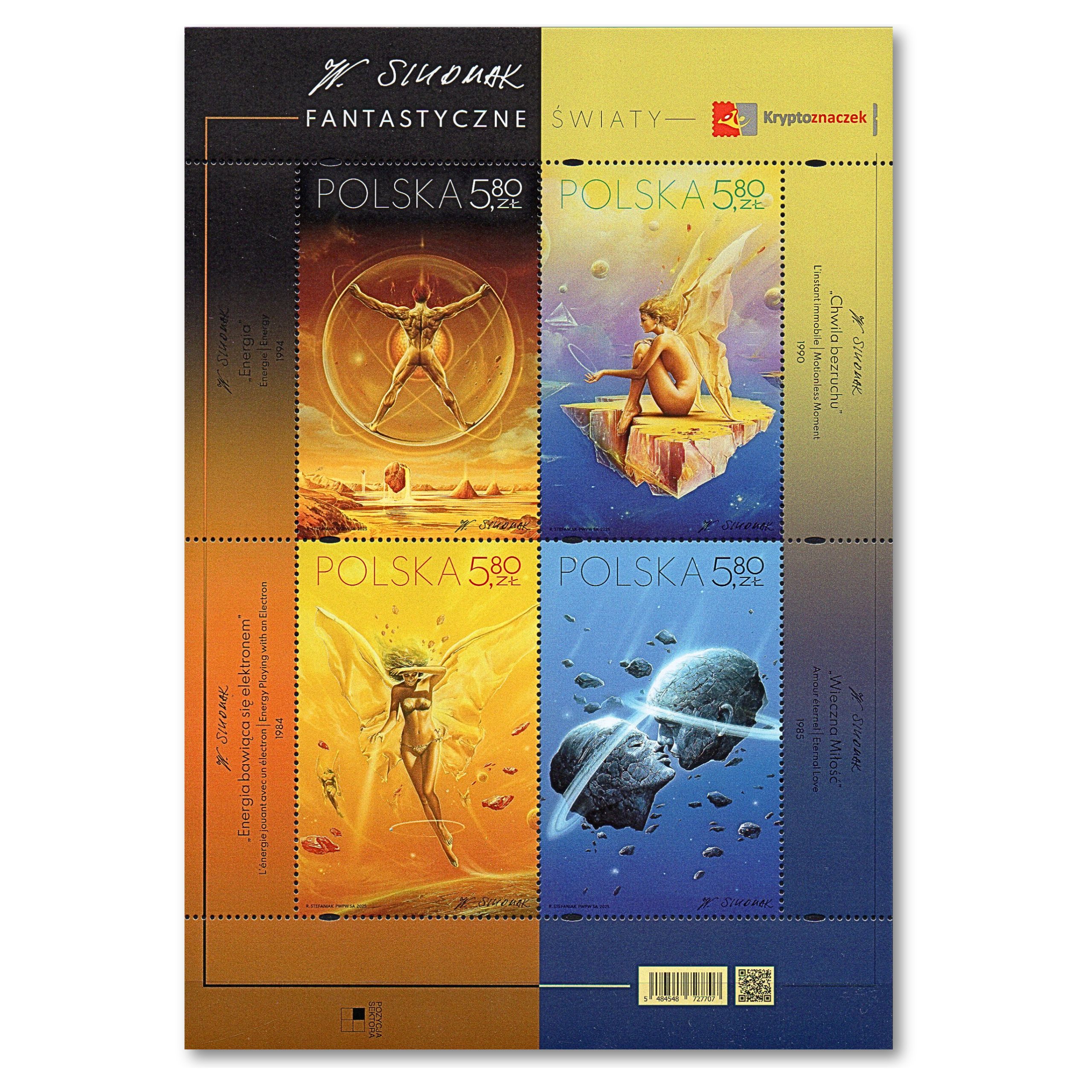 Prezentujemy Państwu wyjątkową serię czterech znaczków pocztowych z 2025 roku, która przenosi odbiorcę w głąb niezwykłego uniwersum realizmu fantastycznego. Emisja „Fantastyczne światy” jest hołdem dla twórczości Wojciecha Siudmaka – polskiego artysty o światowej sławie, którego prace zdobiły m.in. okładki legendarnej sagi „Diuna”. Na poszczególnych walorach uwieczniono cztery ikoniczne obrazy: „Energia” (5484), „Chwila bezruchu” (5485), „Energia bawiąca się elektronem” (5486) oraz pełną metafizycznego piękna „Wieczną Miłość” (5487). Te miniaturowe dzieła sztuki zachwycają precyzją detali i oniryczną atmosferą, stanowiąc perłę w kolekcji każdego miłośnika sztuki współczesnej i fantastyki.