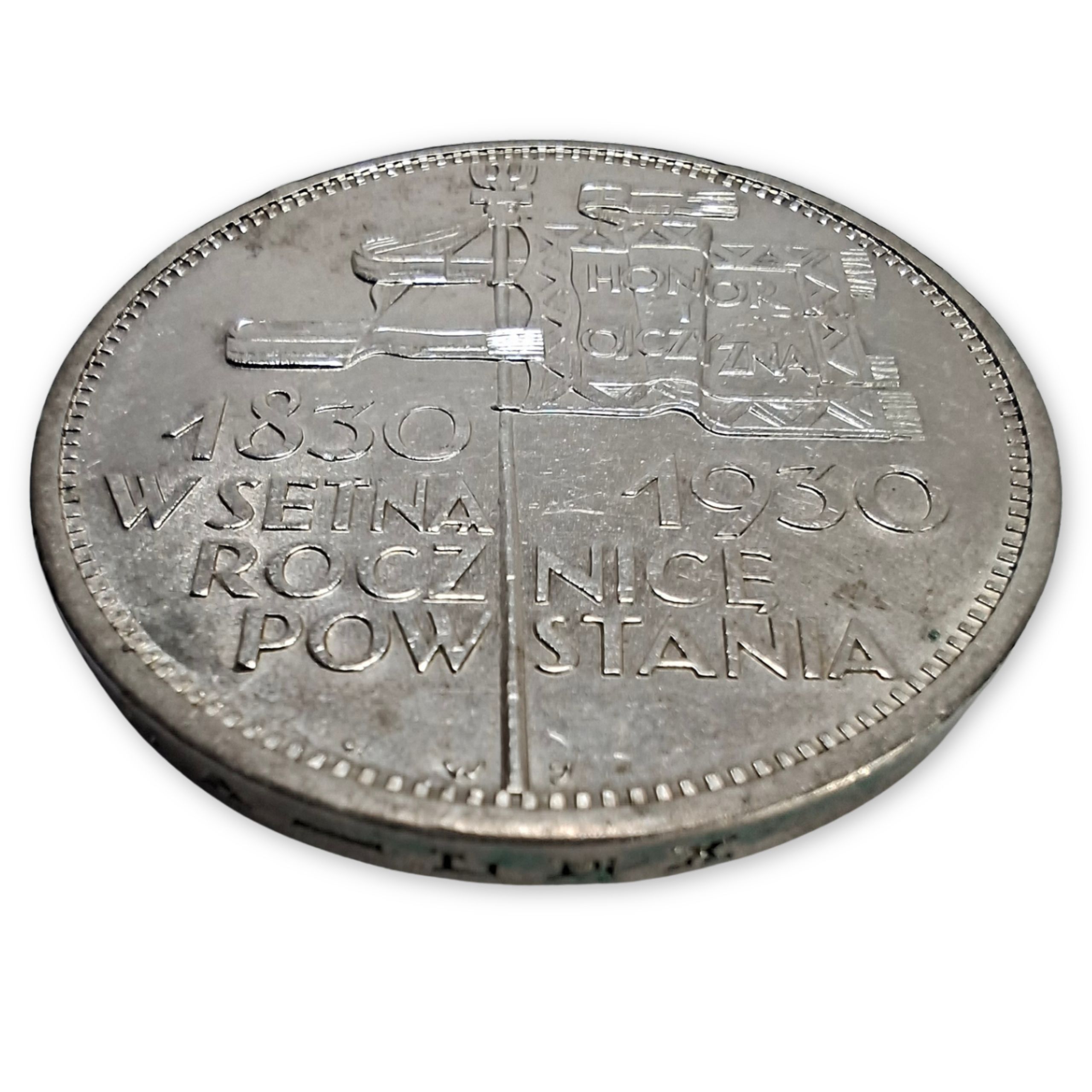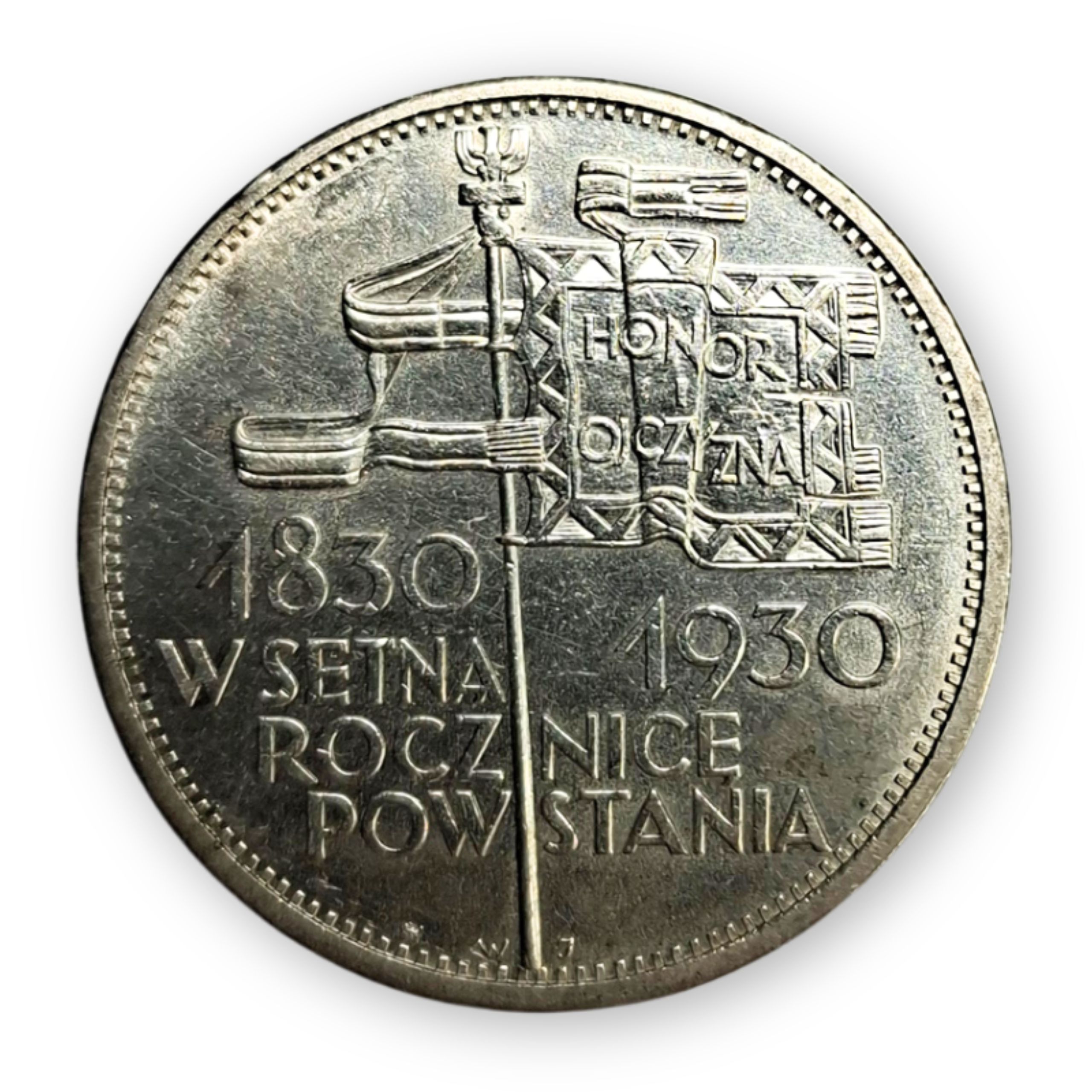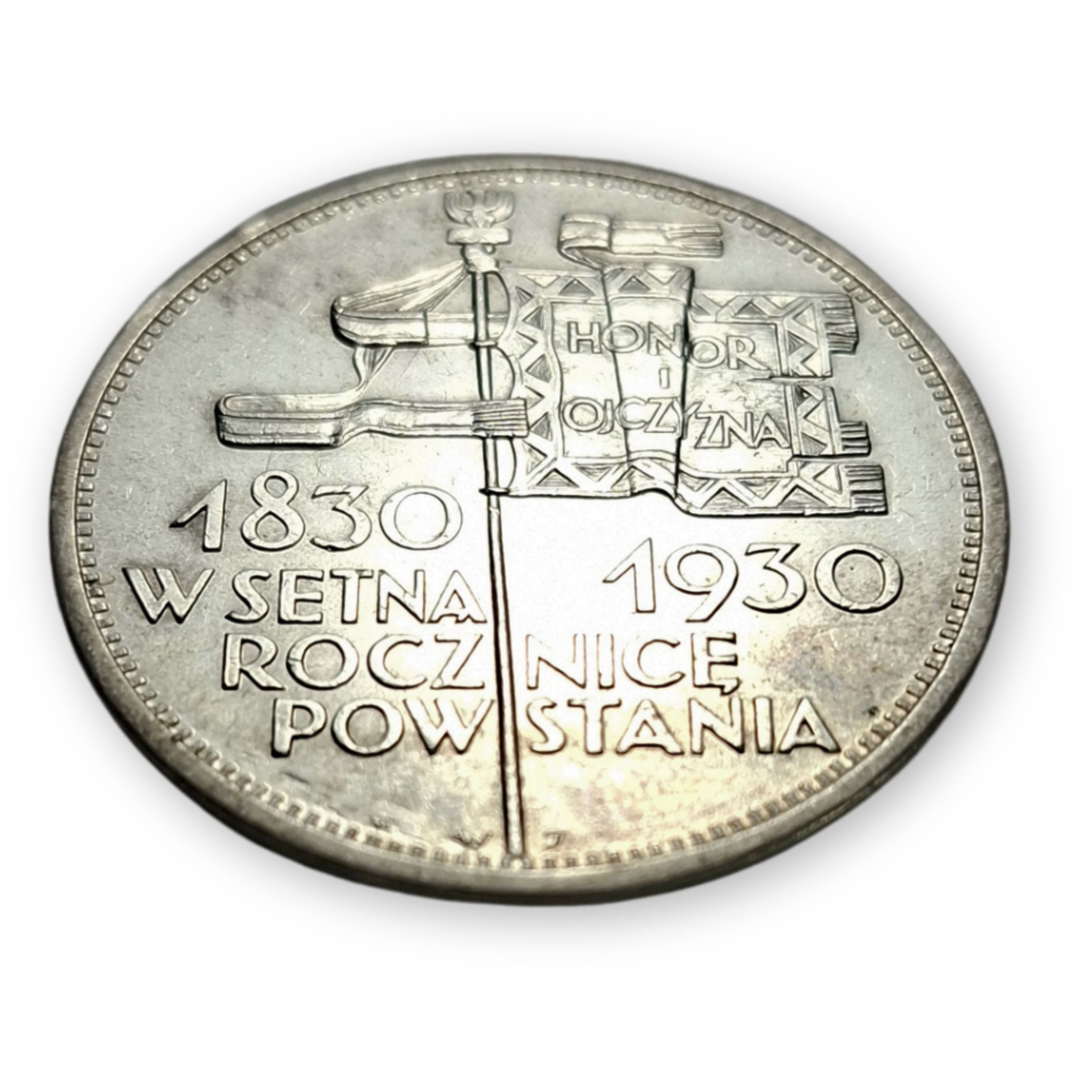 - rewers: sztandar z drzewcem zakończonym głowicą w formie orzełka, na płacie sztandaru napis „HONOR i OJCZYZNA”, poniżej napis „1830 1930 W SETNĄ ROCZNICĘ POWSTANIA”, na samym dole, po obu stronach drzewca, inicjały projektanta WJ, a z lewej strony u dołu herb Kościesza – znak Mennicy Państwowej