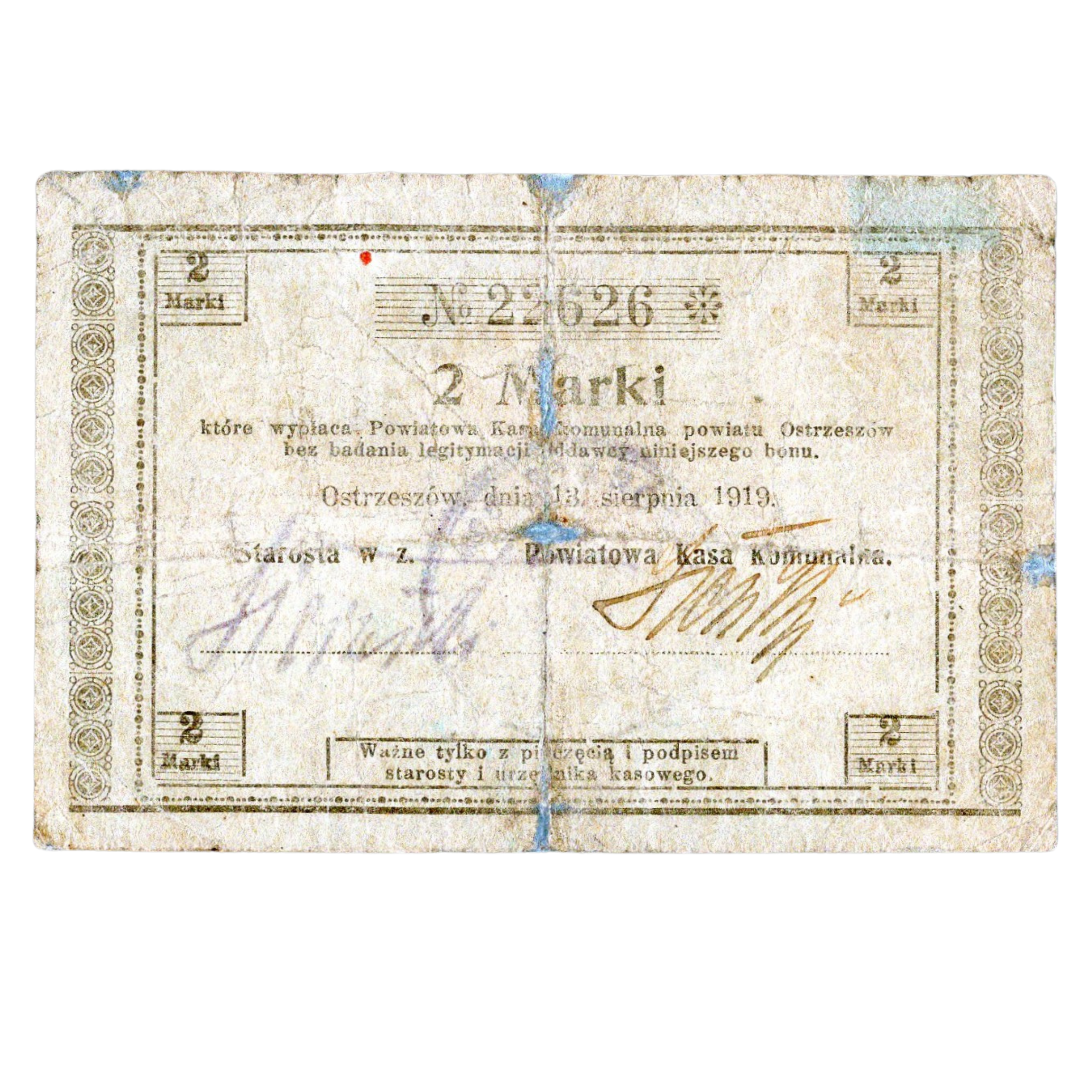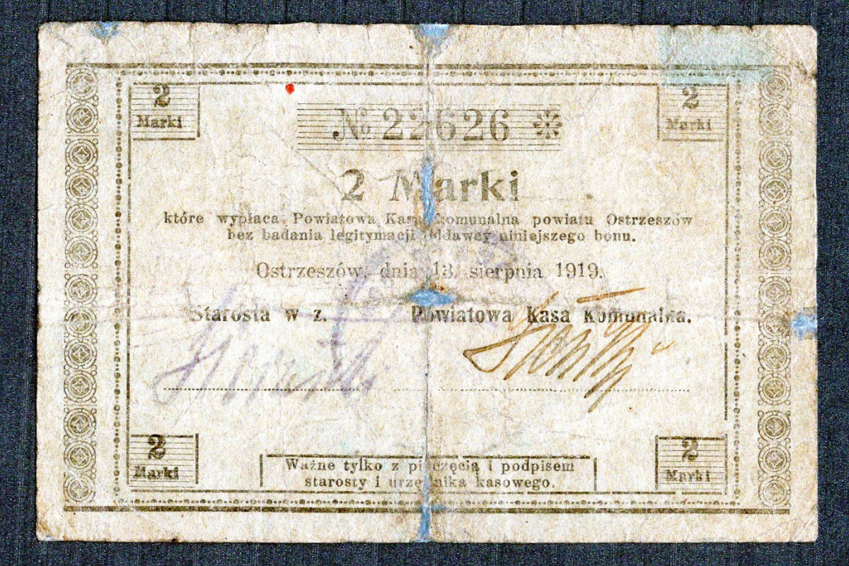 W 1919 roku Ostrzeszów wyemitował własne banknoty o nominale 2 marek, które pełniły funkcję lokalnych środków płatniczych w okresie powojennej niepewności i przemian gospodarczych na terenie Polski. Były to emisje tymczasowe, mające na celu ułatwienie codziennego obiegu pieniądza.