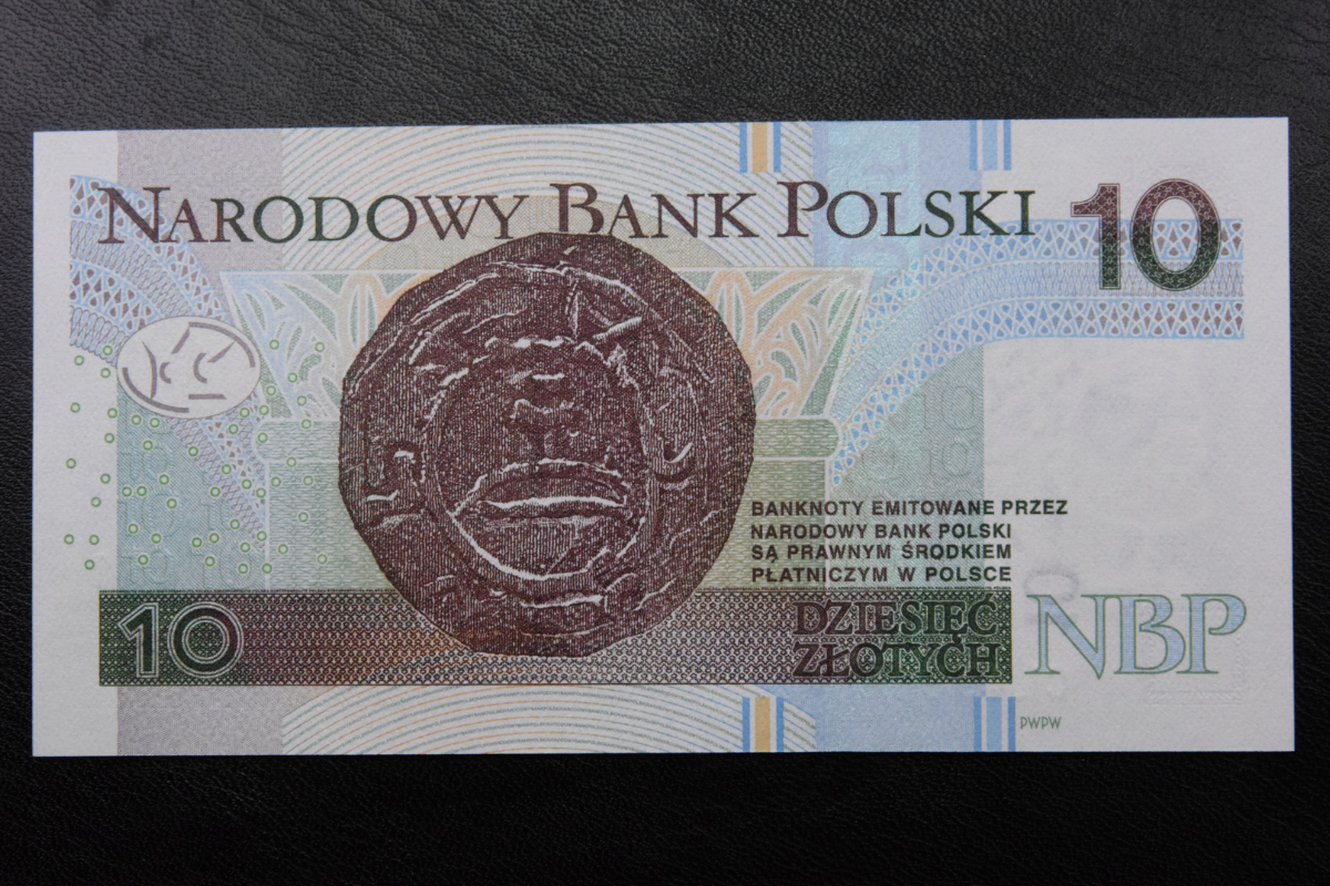 Banknot o nominale 10 złotych zdobi portret księcia Mieszka I. Z jego lewej strony przedstawiono dwie rozety inspirowane wzorem z posadzki katedry gnieźnieńskiej, z prawej – roślinny motyw spotykany na romańskich naczyniach liturgicznych.