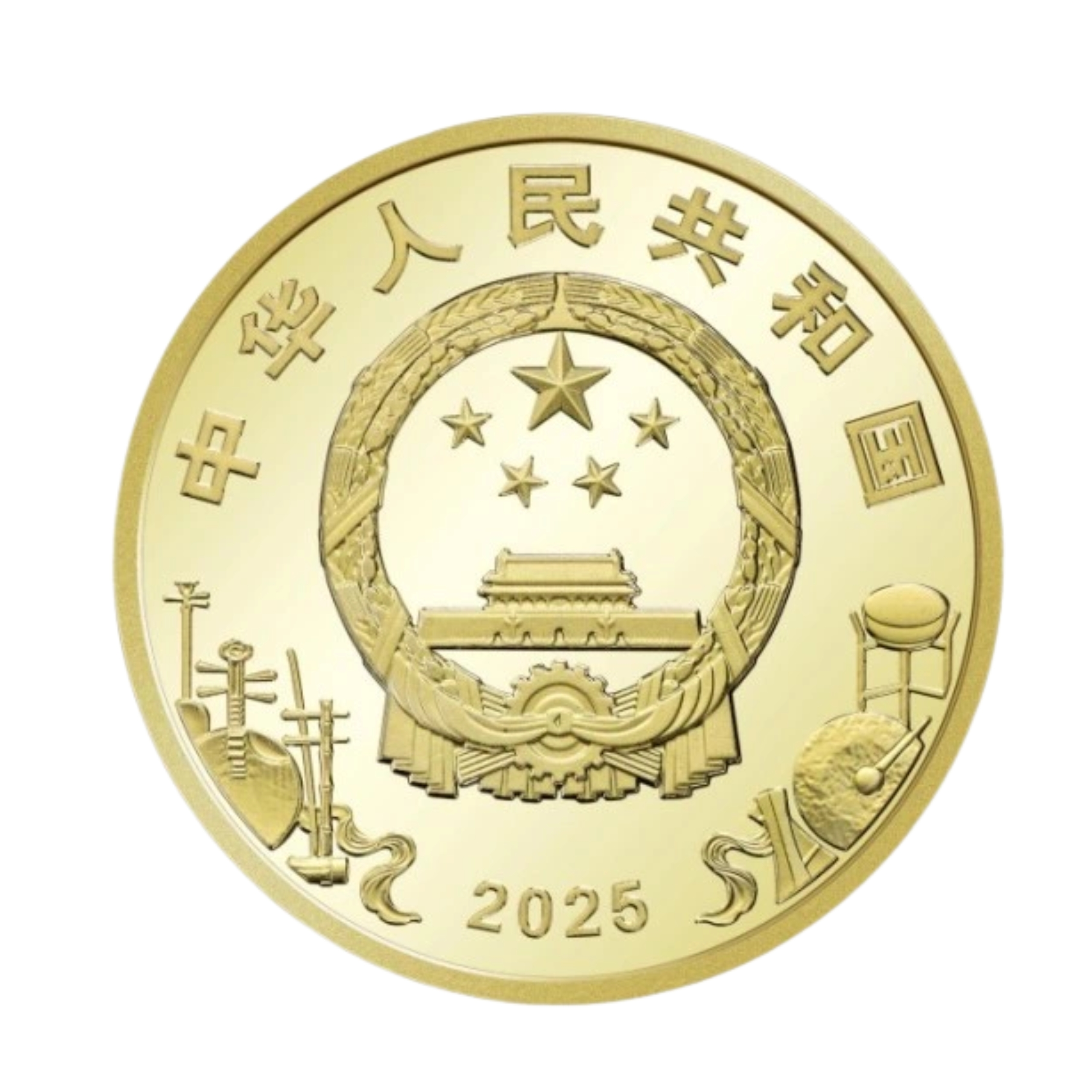 Na awersie widnieje godło państwowe – pięć gwiazd nad Bramą Tian’anmen, otoczone wieńcem zbóż. U dołu znajduje się rok emisji 2025. Kompozycję uzupełniają subtelne motywy dekoracyjne nawiązujące do narodowego dziedzictwa artystycznego Chin.
