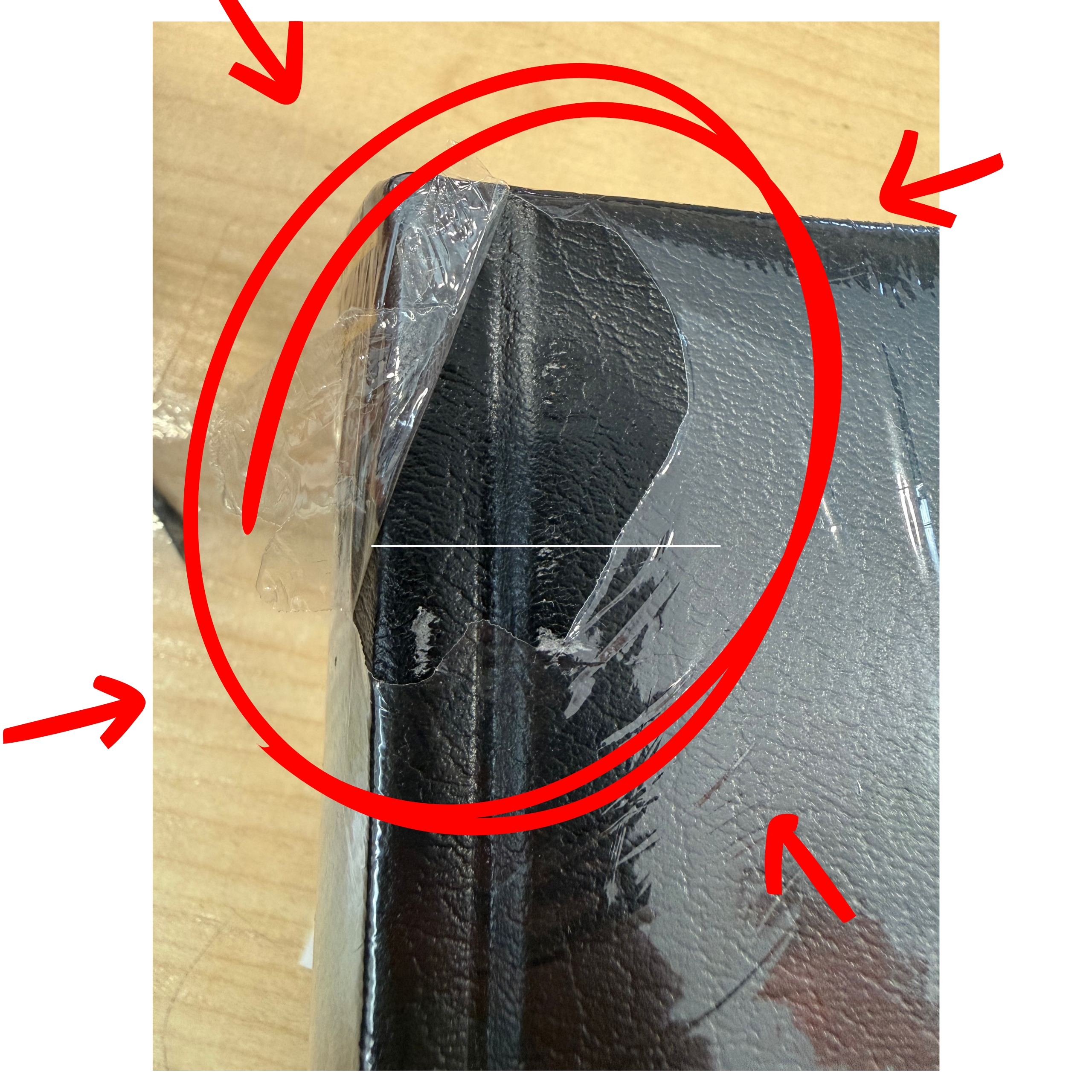 • rozdarcie materiału: w rogu widać przetarcie wierzchniej warstwy okładki