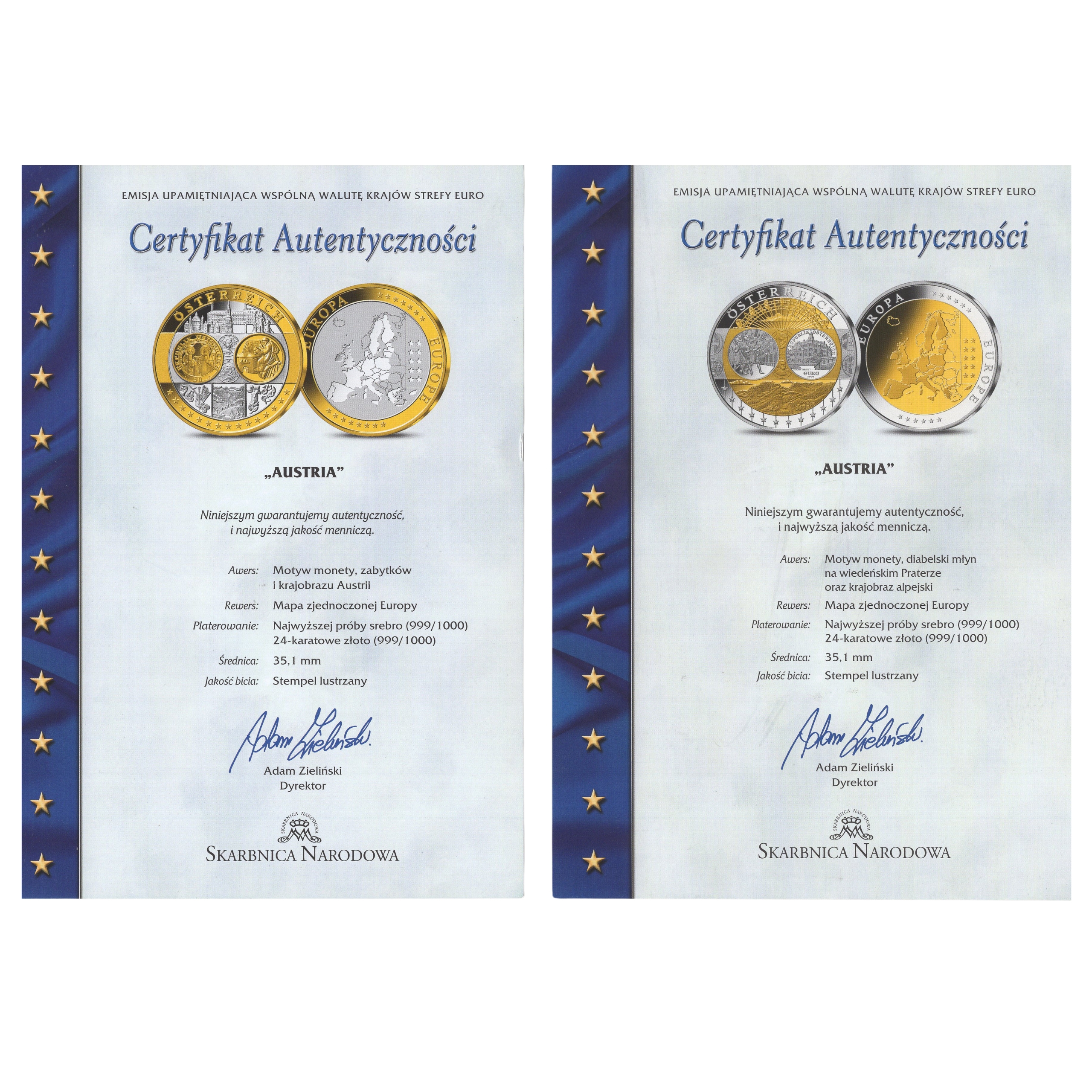 Kolekcjonerski medal pamiątkowy wybity przez Skarbnicę Narodową, upamiętniający integrację europejską. Wykonany z najwyższą dbałością o detale, łączący dwa szlachetne kruszce.