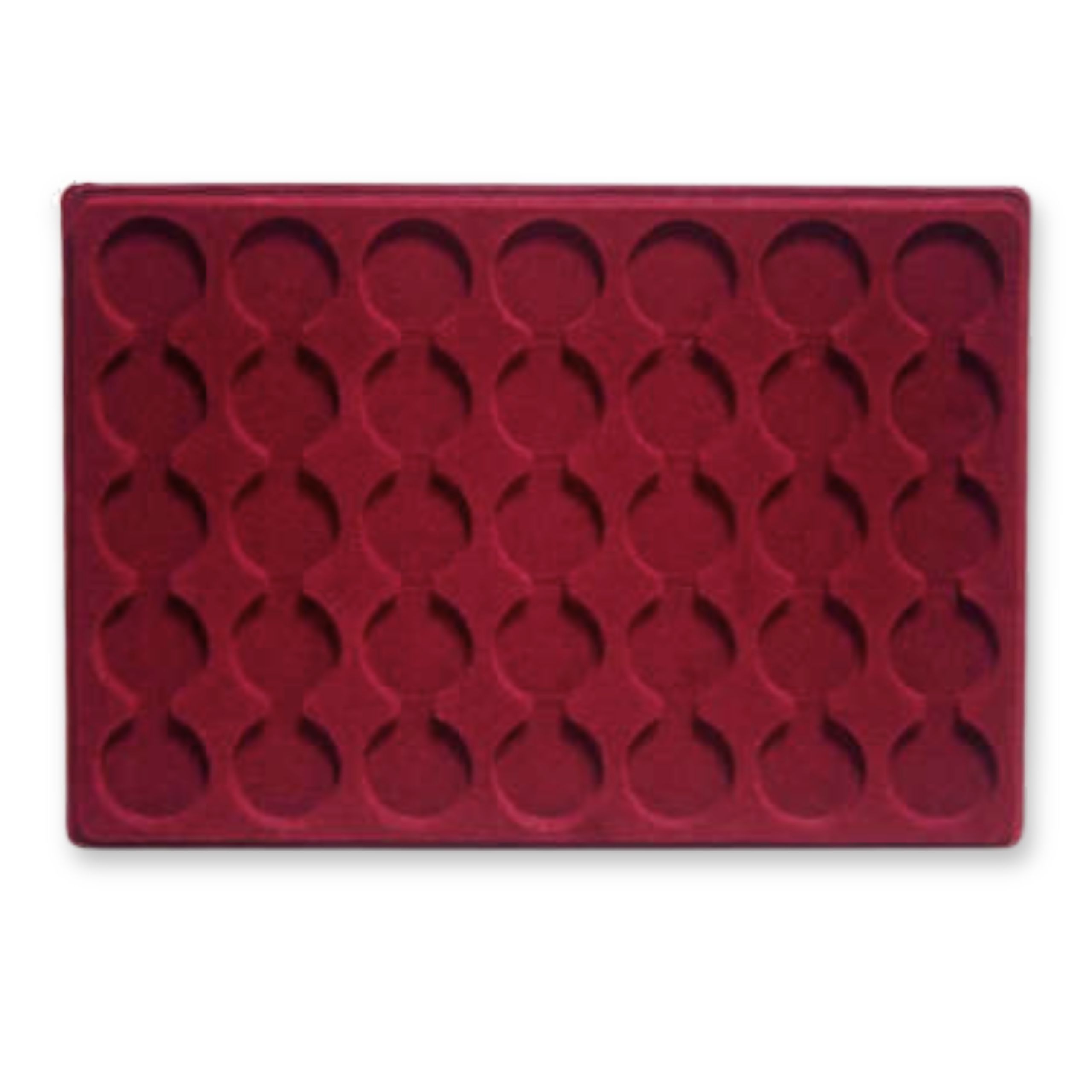 Prestiżowa ekspozycja – aksamitny welur w głębokim odcieniu czerwieni podkreśla piękno numizmatów.