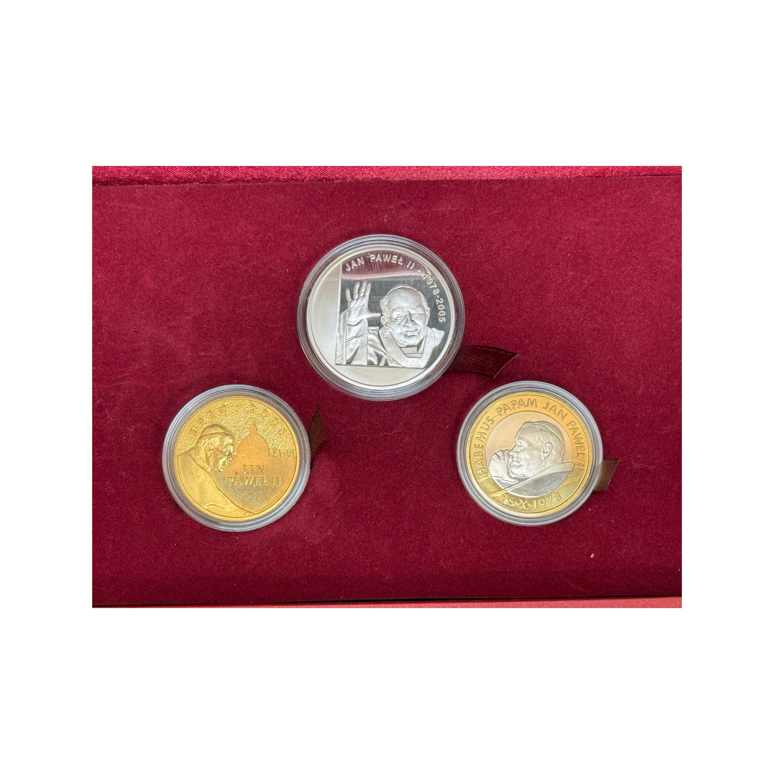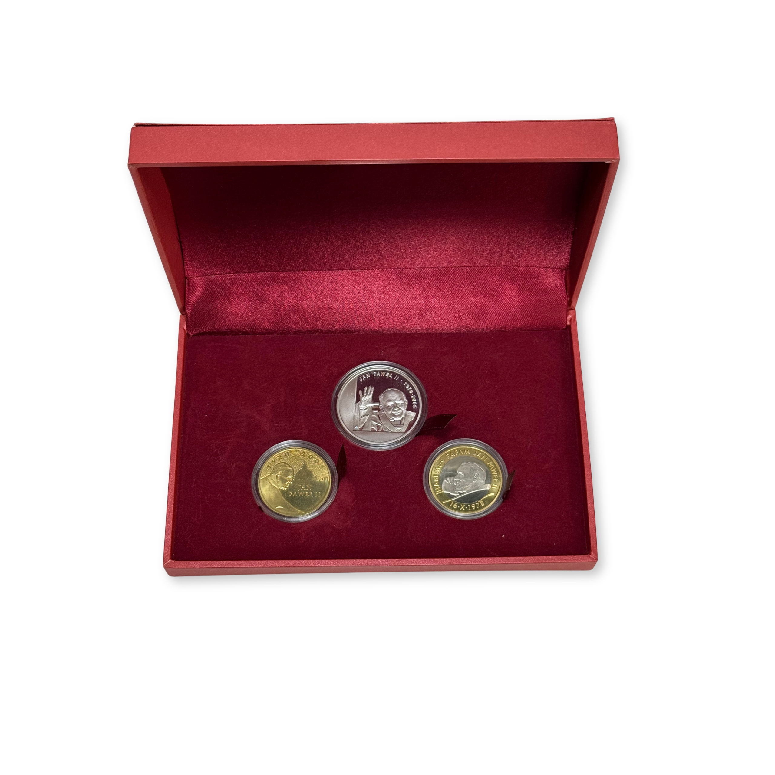 Ekskluzywna kolekcja trzech numizmatów upamiętniających historyczny wybór Karola Wojtyły na Stolicę Piotrową. Zestaw został przygotowany przez prestiżowy Skarbiec Mennicy Polskiej, co gwarantuje najwyższą jakość wykonania oraz autentyczność.